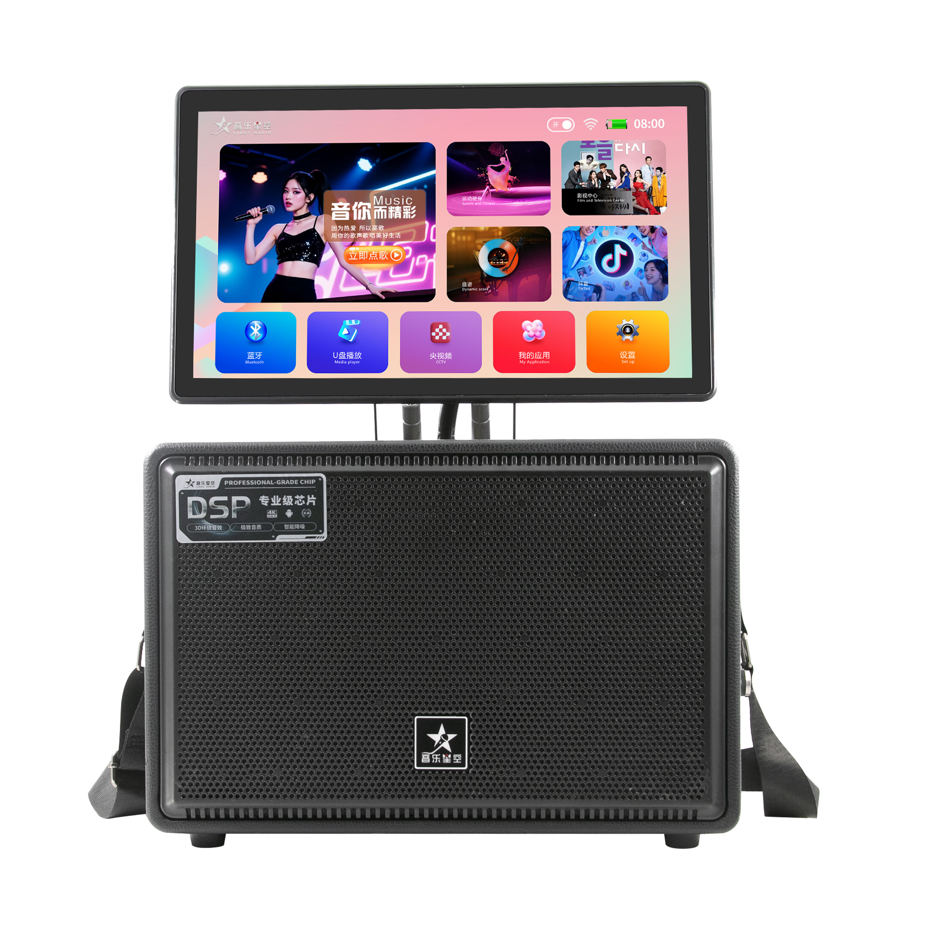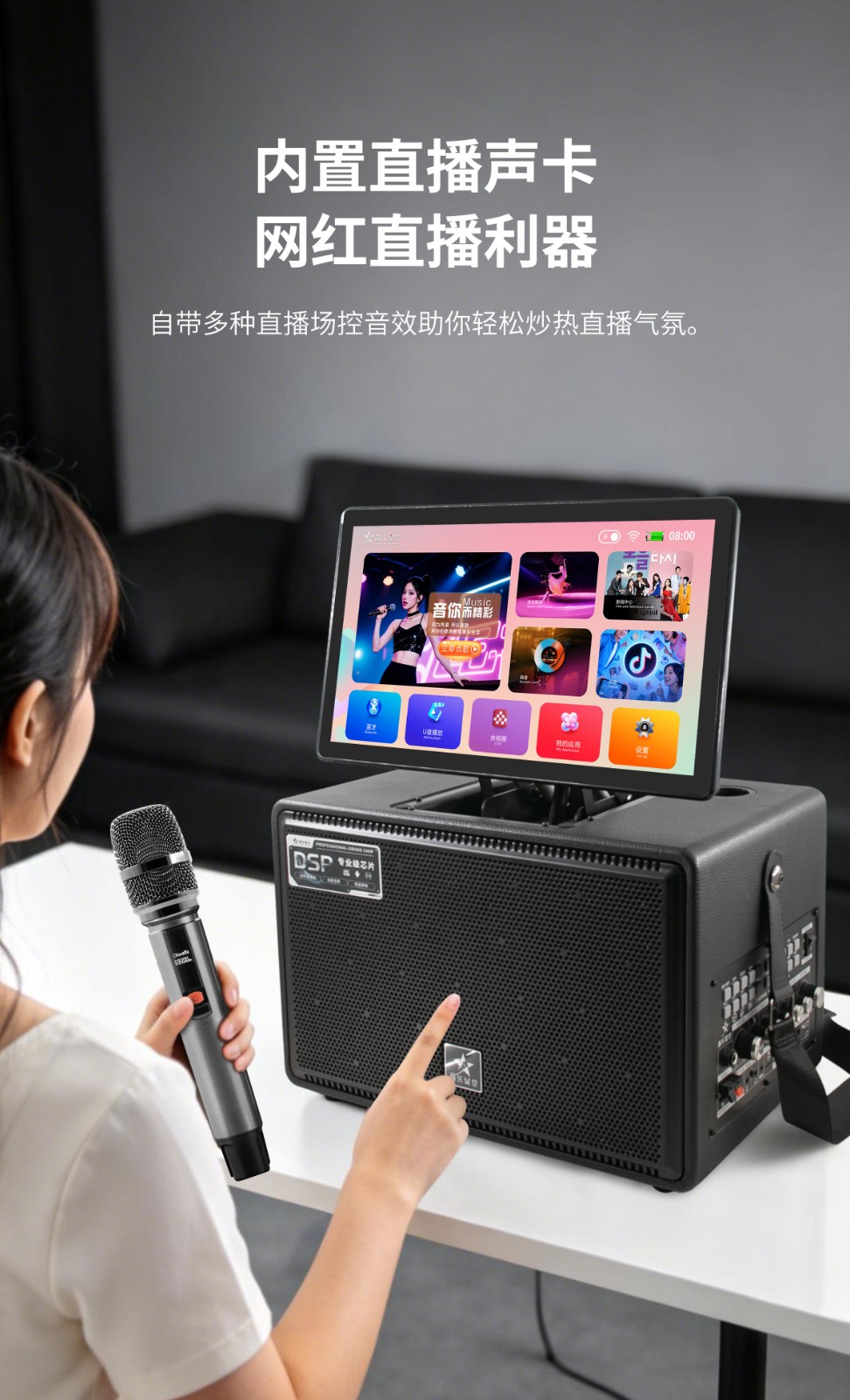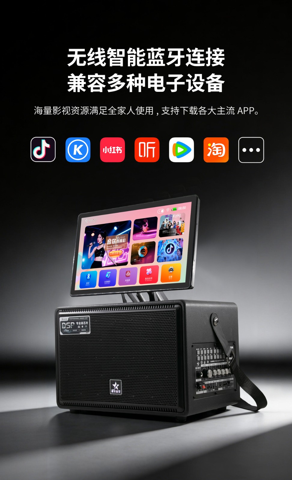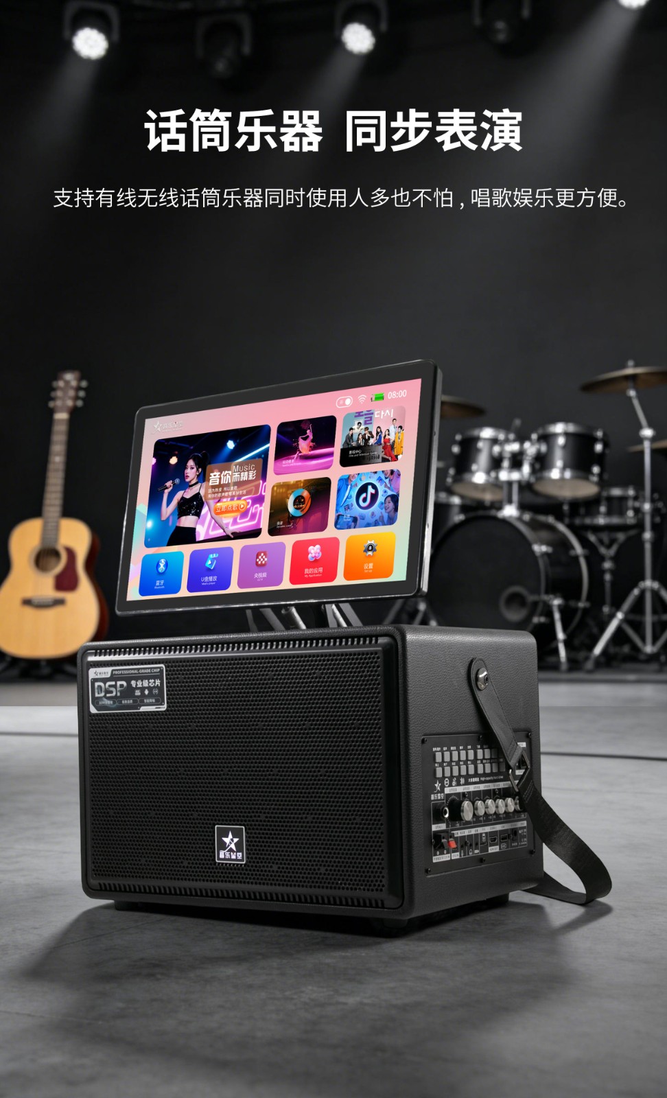 内置专业级功放芯片与高保真发声单元,声音穿透力强,低音沉稳有力。支持双麦无线连接,一键消原音,随时随地畅享原唱伴奏。