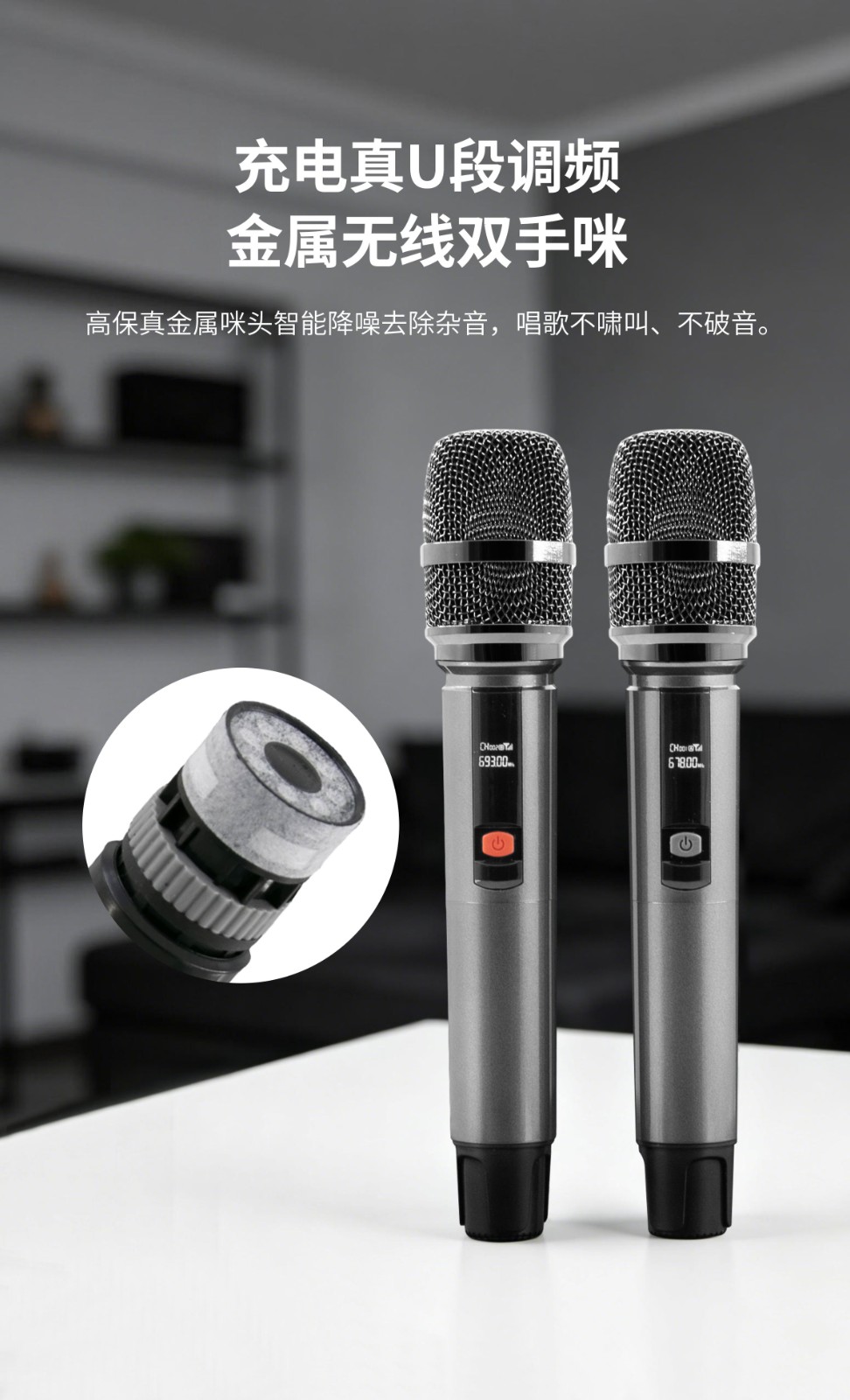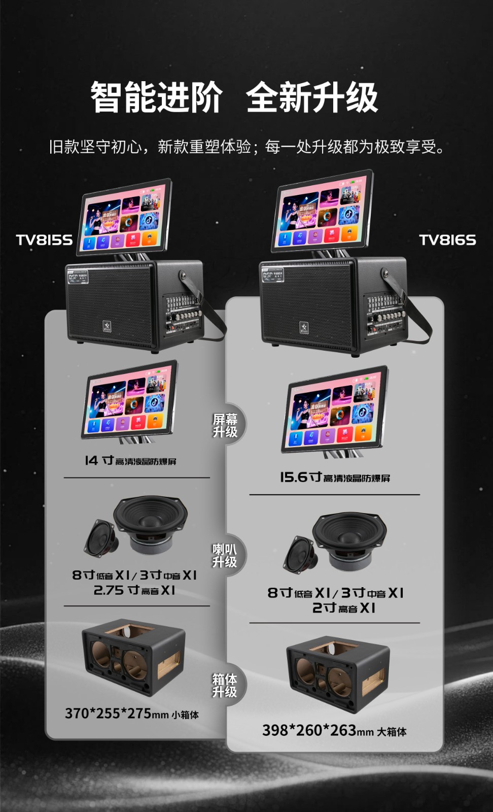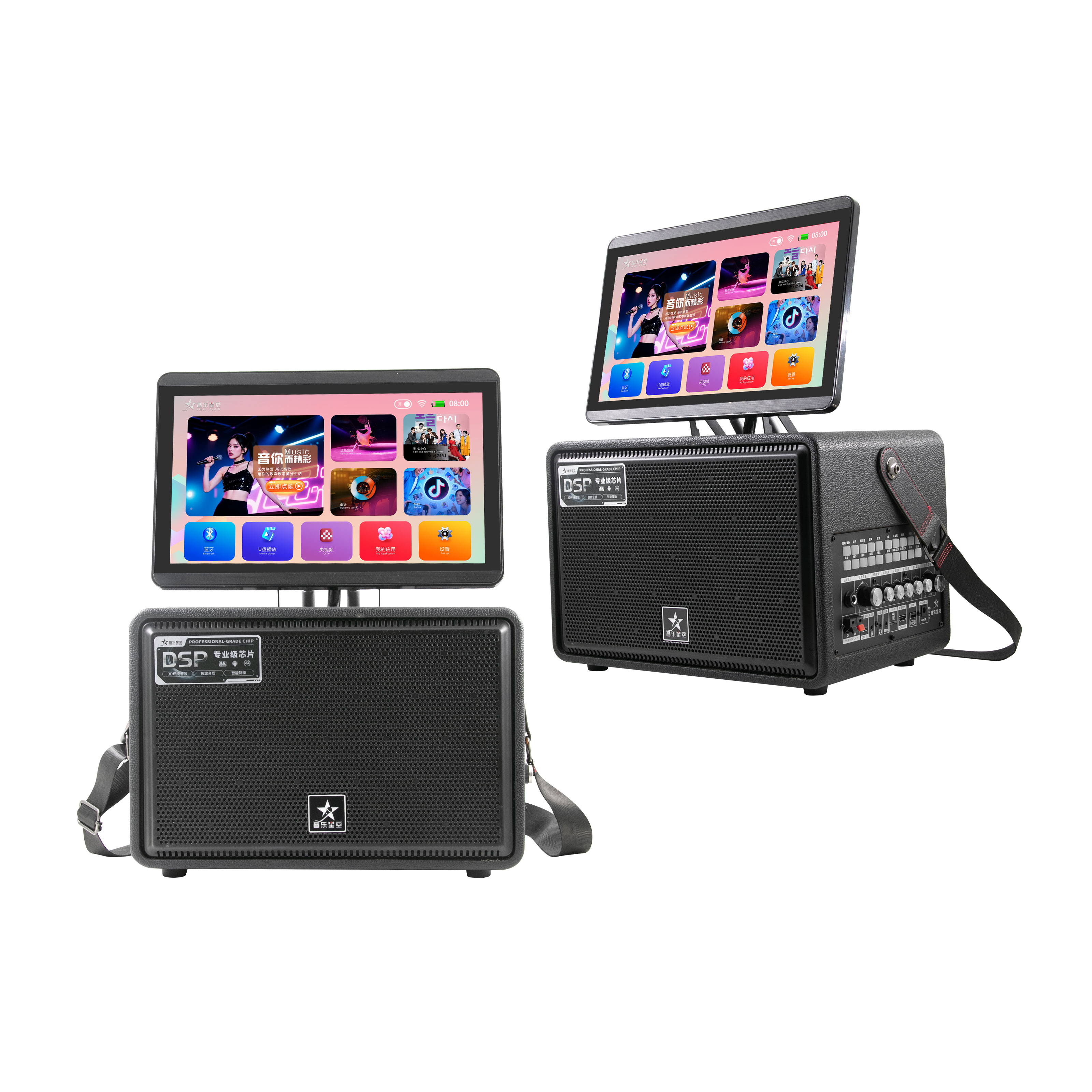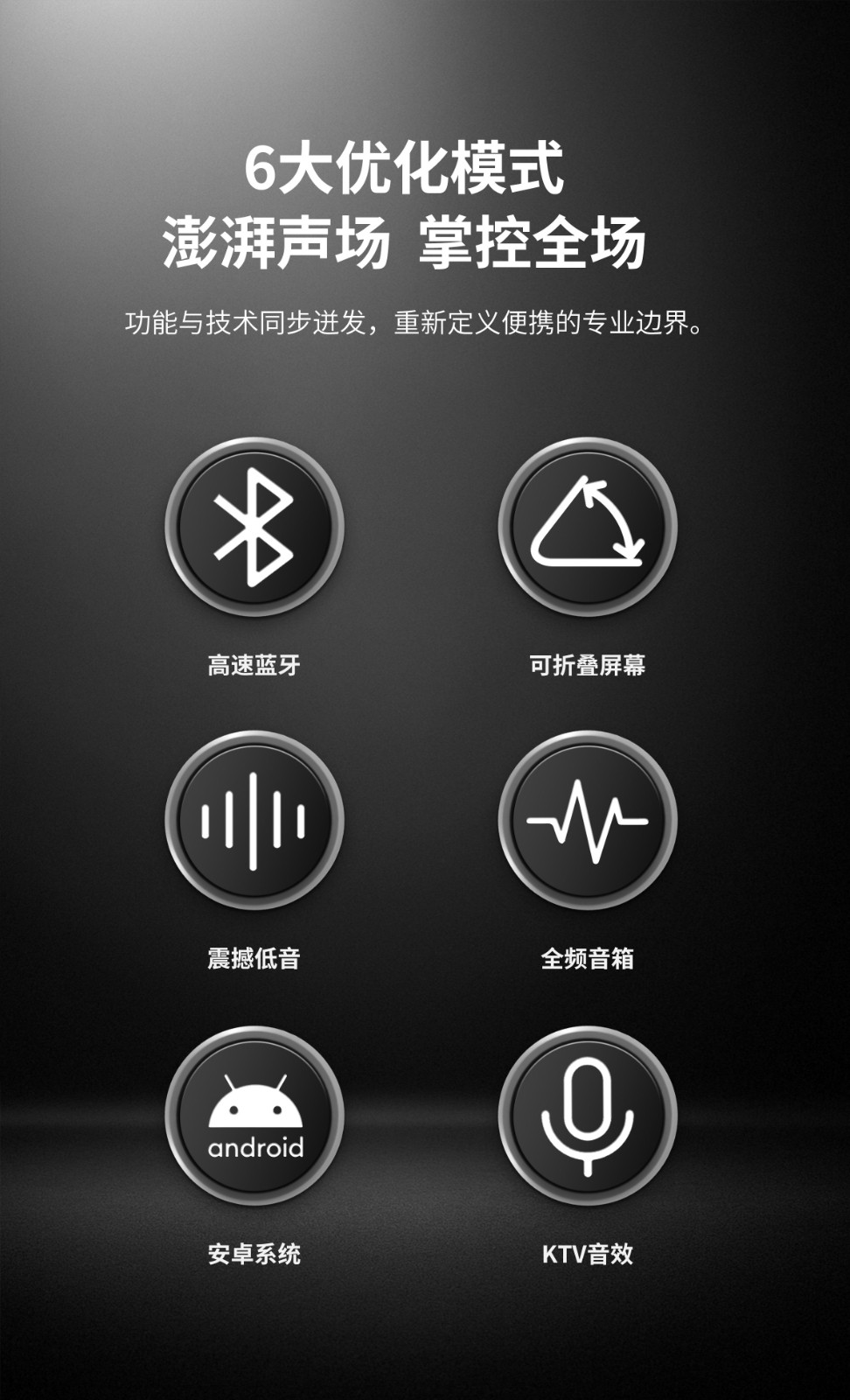 内置专业级功放芯片与高保真发声单元,声音穿透力强,低音沉稳有力。支持双麦无线连接,一键消原音,随时随地畅享原唱伴奏。