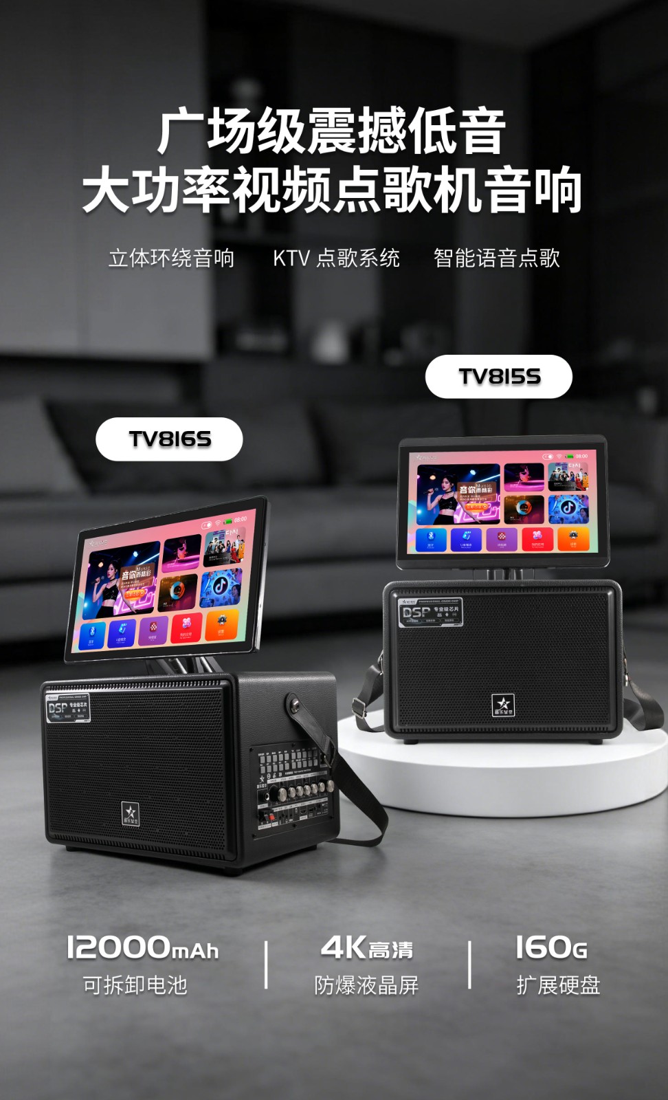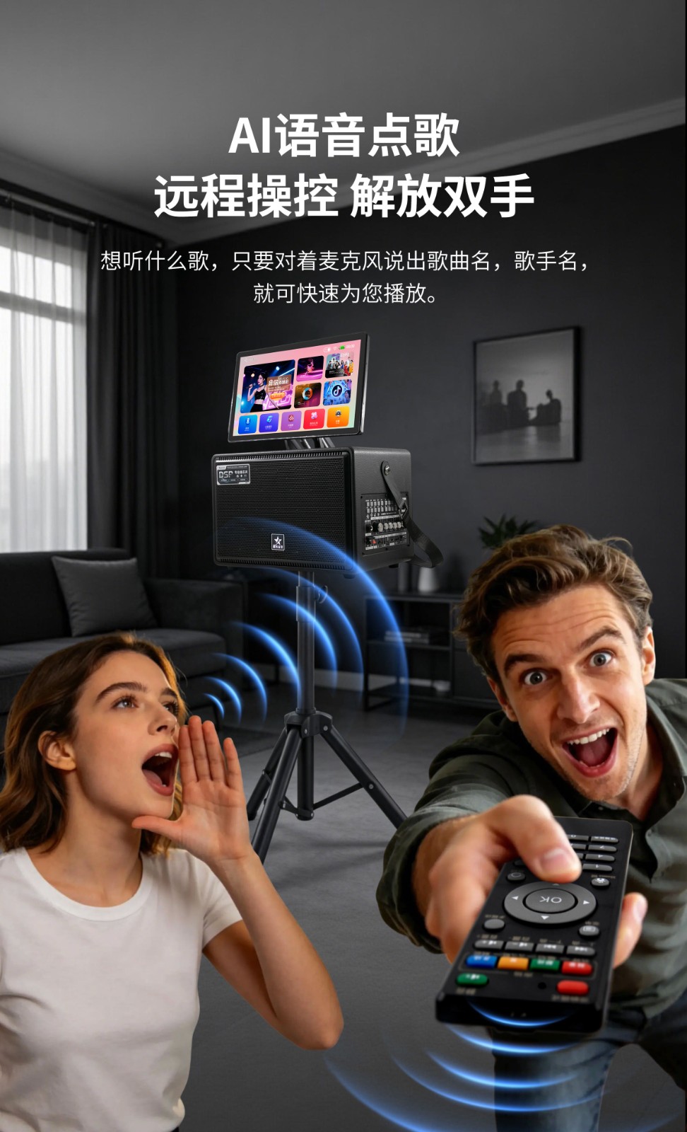搭载高清触控显示屏,支持语音点歌与触屏点歌双模式。无需复杂操作,开口即唱,海量曲库实时更新,体验专业KTV般的便捷选歌乐趣。