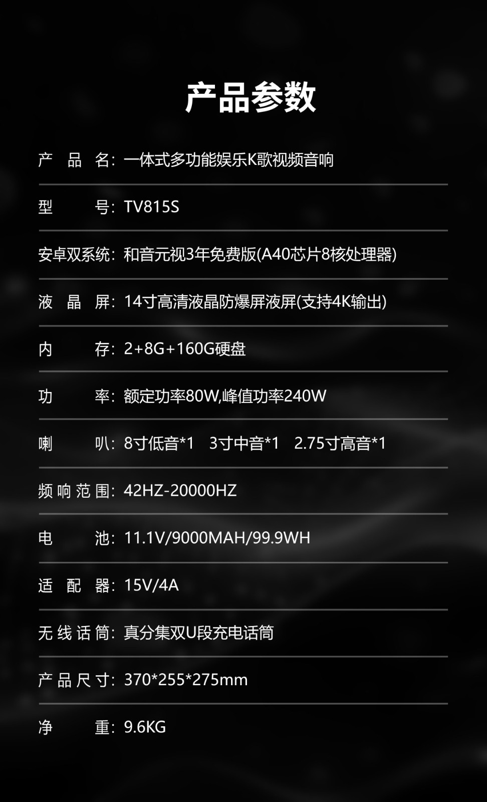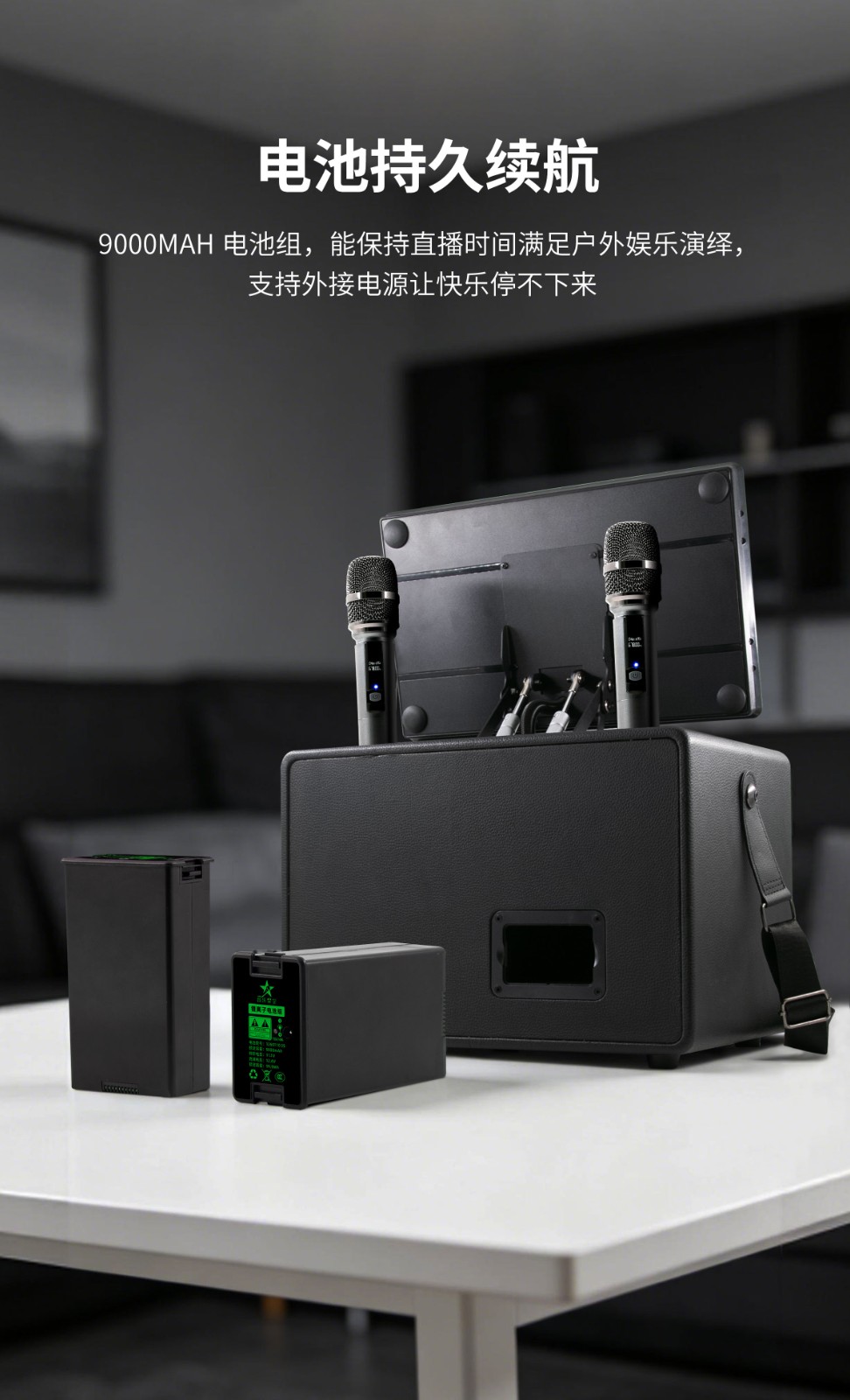 配备大容量锂电池,搭配智能省电技术,实现超长续航,满足全天户外使用需求。轻量化机身设计,提手式外观,露营、商业演出、家庭聚会皆适用。