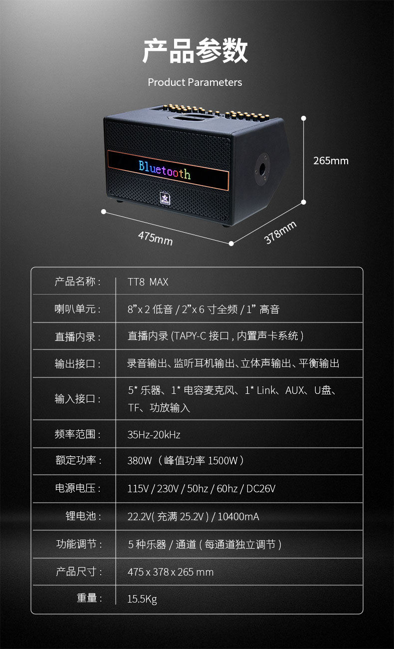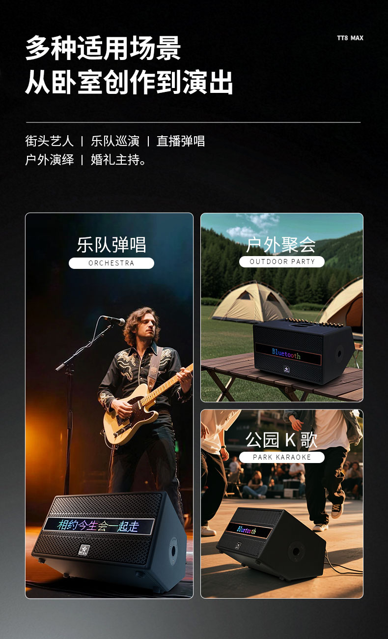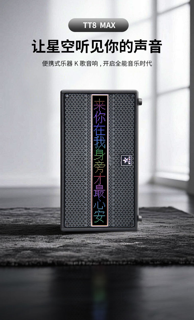 音乐星空TT8是立辉音响推出的多功能户外演艺音响,专为街头弹唱、户外演出、直播K歌、露营娱乐等场景打造,集乐器输入、无线连接、大功率扩声、直播监听于一体,满足专业与休闲双重需求。
