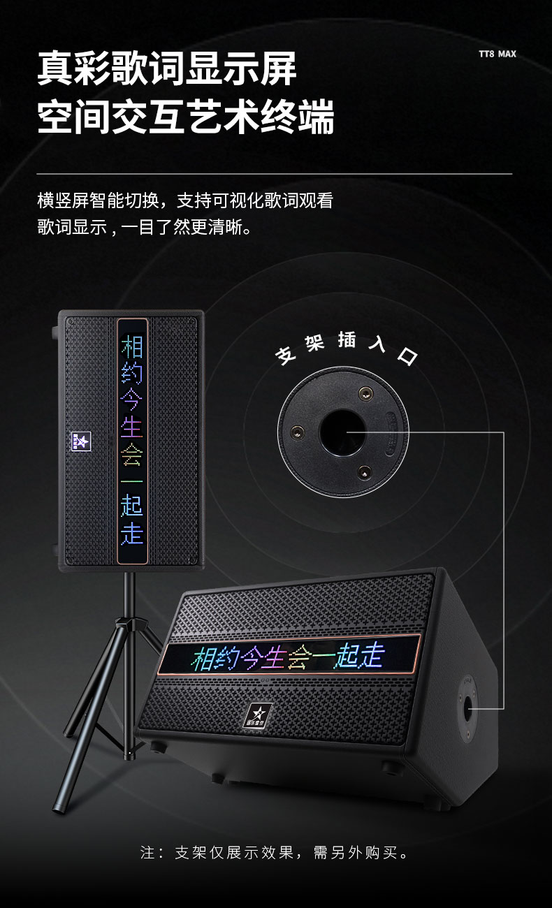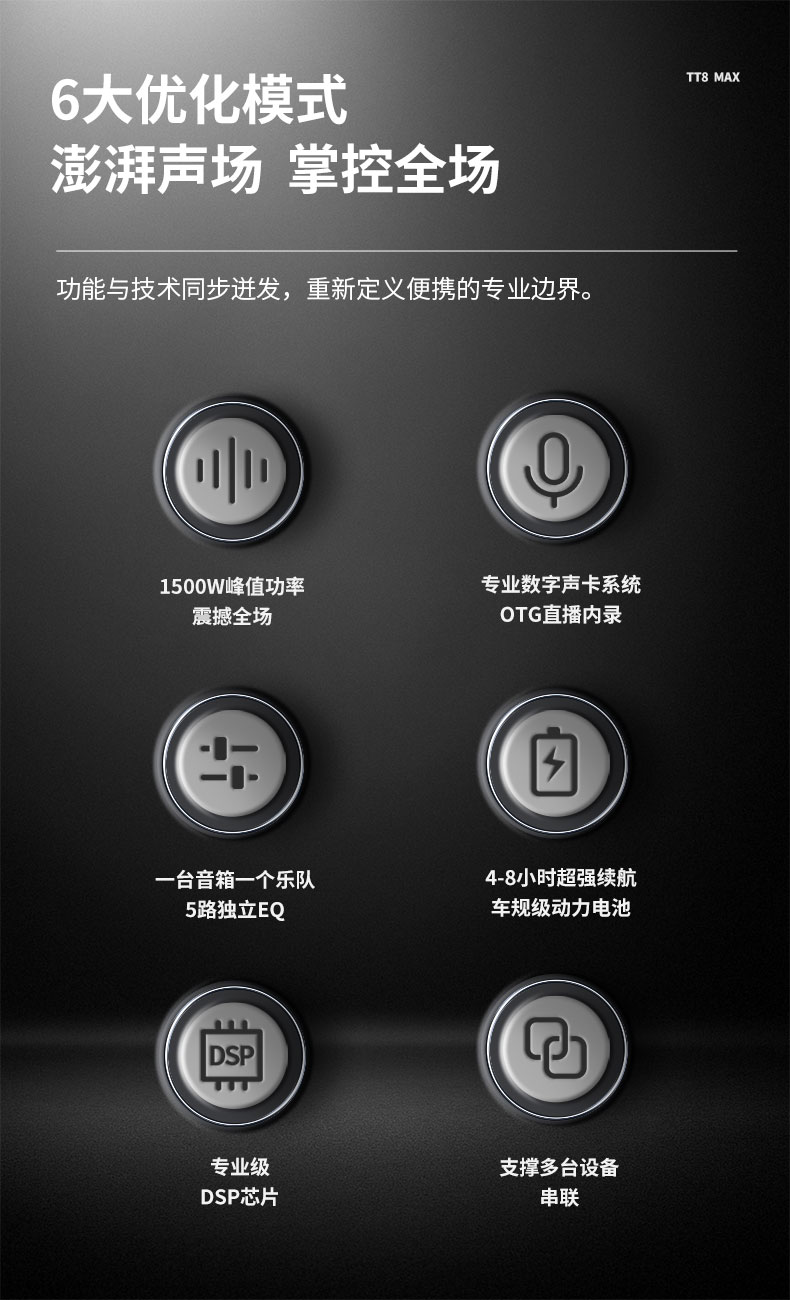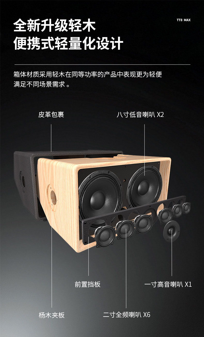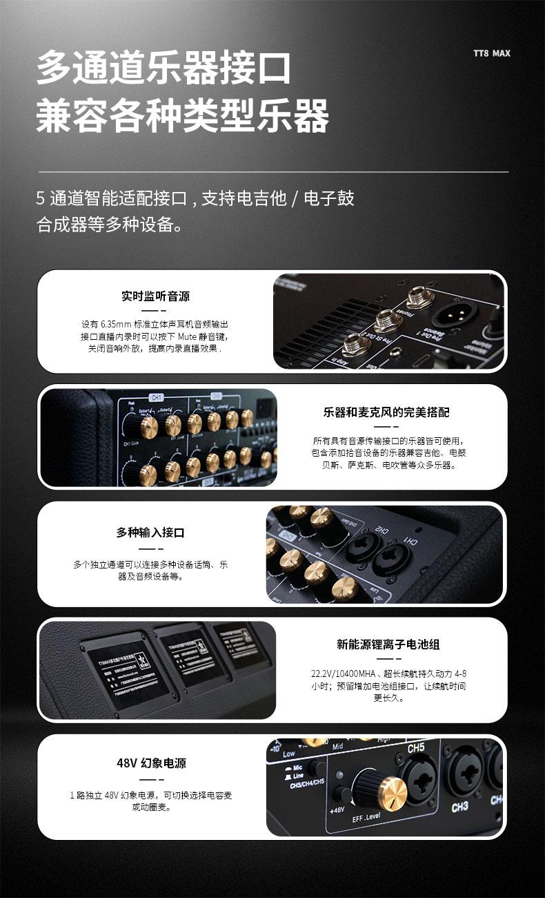 音乐星空TT8是立辉音响推出的多功能户外演艺音响,专为街头弹唱、户外演出、直播K歌、露营娱乐等场景打造,集乐器输入、无线连接、大功率扩声、直播监听于一体,满足专业与休闲双重需求。